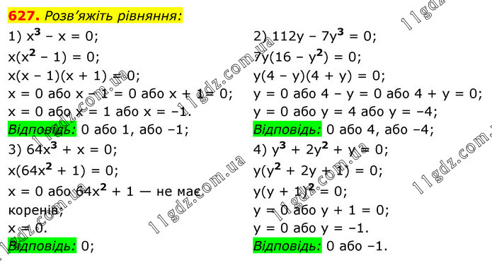 Розв’яжіть рівняння: 1) x3 – x = 0; x(x2 – 1) = 0; x(x – 1)(x + 1) = 0; x = 0 або x – 1 = 0 або x + 1= 0; x = 0 або x = 1 або x = –1. Відповідь: 0 або 1, або –1; 2) 112y – 7y3 = 0; 7y(16 – у2) = 0; y(4 – y)(4 + y) = 0; y = 0 або 4 – у = 0 або 4 + у = 0; у = 0 або у = 4 або у = –4; Відповідь: 0 або 4, або –4; 3) 64x3 + x = 0; x(64x2 + 1) = 0; х = 0 або 64x2 + 1 — не має коренів; х = 0. Відповідь: 0; 4) у3 + 2у2 + у = 0; у(у2 + 2у + 1) = 0; у(у + 1)2 = 0; у = 0 або у + 1 = 0; у = 0 або у = –1. Відповідь: 0 або –1.