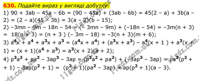 Подайте вираз у вигляді добутку: 1) 90 + 3аb – 45а – 6b = (90 – 45а) + (3аb – 6b) = 45(2 – а) + 3b(а – 2) = (2 – а)(45 – 3b) = 3(а – 2)(b – 15); 2) –3mn – 9m – 18n – 54 = (– 3mn – 9m) + (–18n – 54) = –3m(n + 3) = 18(n + 3) = (n + 3 ) (– 3m – 18) = –3(n + 3)(m + 6); 3) a4x + a4 + a3x + а3 = (a4x + a4) + (a3x + a3) – a4(x + 1 ) + a3(x + 1) = (x + 1)(a4 + a3) = a3(x + 2)(a + 2); 4) p3a2 + pa2 – 3ар3 – 3ap = (p3a2 + pa2) + (–3ap3 – 3ap) = ра2(p2 + + 1) – 3ap(p2 + 1) = (p2 + 1)(pa2 – 3ap) = ap(p2 + 1)(a – 3).