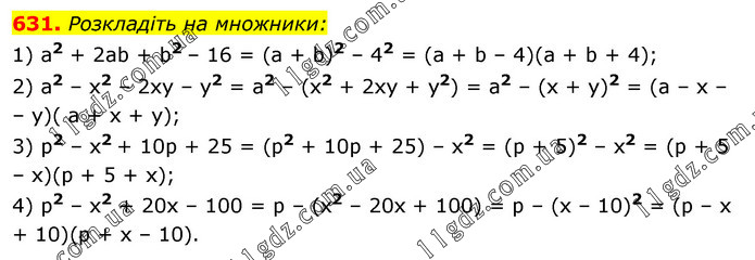 Розкладіть на множники: 1) a2 + 2ab + b2 – 16 = (a + b)2 – 42 = (a + b – 4)(a + b + 4); 2) a2 – x2 – 2xy – y2 = a2 – (x2 + 2xy + y2) = a2 – (x + y)2 = (a – x – – y)( a + x + y); 3) p2 – x2 + 10p + 25 = (p2 + 10p + 25) – x2 = (p + 5)2 – x2 = (p + 5 – x)(p + 5 + x); 4) p2 – x2 + 20x – 100 = p – (x2 – 20x + 100) = p – (x – 10)2 = (p – x + 10)(p + x – 10).