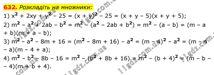 Розкладіть на множники: 1) x2 + 2xy + y2 – 25 = (x + y)2 – 25 = (x + у – 5)(x + y + 5); 2) m2 – a2 + 2ab – b2 = m2 – (a2 – 2ab + b2) = m2 – (a – b) = (m – a + b)(m + a – b); 3) m2 – a2 – 8m + 16 = (m2 – 8m + 16) – a2 = (m – 4)2 – a2 = (m – 4 – a)(m – 4 + a); 4) m2 – b2 – 8b – 16 = m2 – (b2 + 8b + 16) = m2 – (b + 4)2 = (m – b – – 4)(m + b + 4).