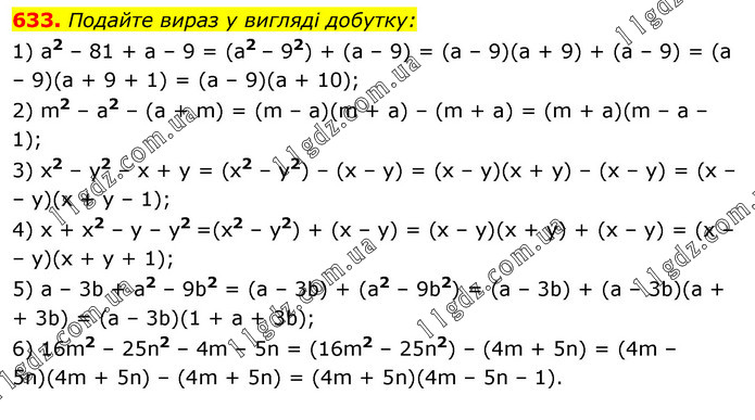 Подайте вираз у вигляді добутку: 1) a2 – 81 + a – 9 = (a2 – 92) + (a – 9) = (a – 9)(a + 9) + (a – 9) = (a – 9)(a + 9 + 1) = (a – 9)(a + 10); 2) m2 – a2 – (a + m) = (m – a)(m + a) – (m + a) = (m + a)(m – a – 1); 3) x2 – y2 – x + y = (x2 – y2) – (x – y) = (x – y)(x + y) – (x – y) = (x – – y)(x + y – 1); 4) x + x2 – y – y2 =(x2 – y2) + (x – y) = (x – y)(x + y) + (x – y) = (x – – y)(x + y + 1); 5) a – 3b + a2 – 9b2 = (a – 3b) + (a2 – 9b2) = (a – 3b) + (a – 3b)(a + + 3b) = (a – 3b)(1 + a + 3b); 6) 16m2 – 25n2 – 4m – 5n = (16m2 – 25n2) – (4m + 5n) = (4m – 5n)(4m + 5n) – (4m + 5n) = (4m + 5n)(4m – 5n – 1).