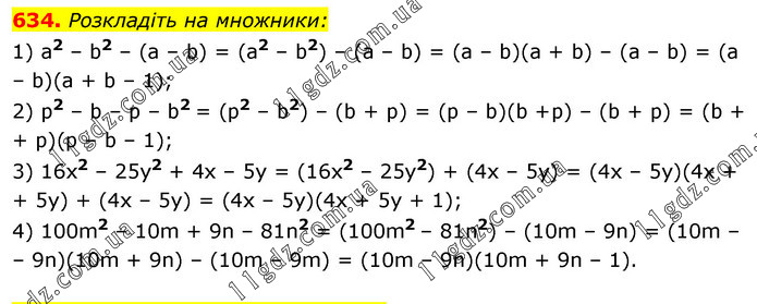 Розкладіть на множники: 1) a2 – b2 – (a – b) = (a2 – b2) – (a – b) = (a – b)(a + b) – (a – b) = (a – b)(a + b – 1); 2) p2 – b – p – b2 = (p2 – b2) – (b + p) = (p – b)(b +p) – (b + p) = (b + + p)(p – b – 1); 3) 16x2 – 25y2 + 4x – 5y = (16x2 – 25y2) + (4x – 5y) = (4x – 5y)(4x + + 5y) + (4x – 5y) = (4x – 5y)(4x + 5y + 1); 4) 100m2 – 10m + 9n – 81n2 = (100m2 – 81n2) – (10m – 9n) = (10m – – 9n)(10m + 9n) – (10m – 9m) = (10m – 9n)(10m + 9n – 1).