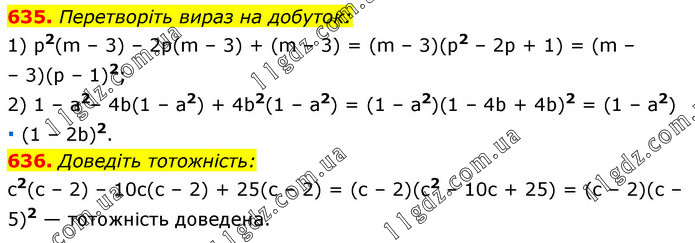 635. Перетворіть вираз на добуток: 1) р2(m – 3) – 2р(m – 3) + (m – 3) = (m – 3)(р2 – 2р + 1) = (m – – 3)(р – 1)2; 2) 1 – а2– 4b(1 – а2) + 4b2(1 – а2) = (1 – a2)(1 – 4b + 4b)2 = (1 – а2) ∙ (1 – 2b)2. 636. Доведіть тотожність: с2(с – 2) – 10с(с – 2) + 25(с – 2) = (с – 2)(с2 – 10c + 25) = (с – 2)(с – 5)2 — тотожність доведена.