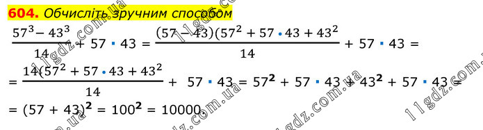 Обчисліть зручним способом (57^3- 43^3)/14 + 57 ∙ 43 = ((57 - 43)(57^2 + 57 • 43 + 43^2)/14 + 57 ∙ 43 = = (14(57^2 + 57 • 43 + 43^2)/14 + 57 ∙ 43 = 572 + 57 ∙ 43 + 432 + 57 ∙ 43 = = (57 + 43)2 = 1002 = 10000.