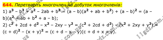 Перетворіть многочлен на добуток многочленів: 1) а3 – b3 + а2 – 2аb + b2 = (а – b)(а2 + ab + b2) + (а – b)2 = (а – b)(а2 + аb + b2 + а – b); 2) с2 + 2cd + d2 – x2 – 2хy – у2 = (с2 + 2cd + d2) – (х2 + 2хy + y2) = (с + d)2 – (х + у)2 = (с + d – x – у)(с + d + х + у).