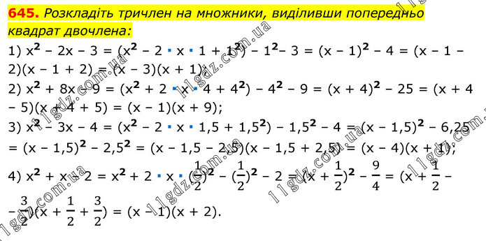 Розкладіть тричлен на множники, виділивши попередньо квадрат двочлена: 1) x2 – 2х – 3 = (х2 – 2 ∙ х ∙ 1 + 12) – 12– 3 = (х – 1)2 – 4 = (х – 1 – 2)(х – 1 + 2) = (х – 3)(х + 1); 2) x2 + 8х – 9 = (х2 + 2 ∙ х ∙ 4 + 42) – 42 – 9 = (х + 4)2 – 25 = (х + 4 – 5)(х + 4 + 5) = (х – 1)(х + 9); 3) x2 – 3х – 4 = (х2 – 2 ∙ х ∙ 1,5 + 1,52) – 1,52 – 4 = (х – 1,5)2 – 6,25 = (х – 1,5)2 – 2,52 = (х – 1,5 – 2,5)(х – 1,5 + 2,5) = (х – 4)(х + 1); 4) x2 + x – 2 = x2 + 2 ∙ x ∙ (1/2)2 – (1/2)2 – 2 = (x + 1/2)2 – 9/4 = (x + 1/2 – – 3/2)(x + 1/2 + 3/2) = (x – 1)(x + 2).