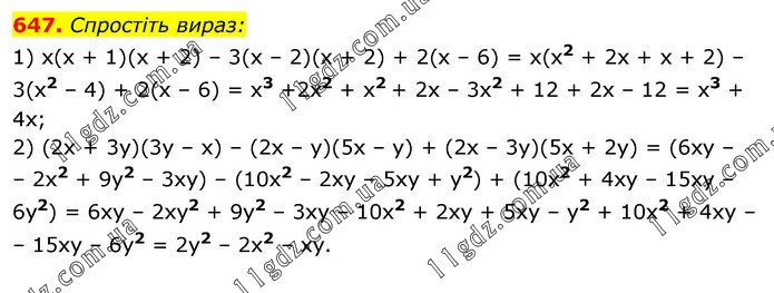 Спростіть вираз: 1) х(х + 1)(х + 2) – 3(х – 2)(х + 2) + 2(х – 6) = х(х2 + 2х + х + 2) – 3(х2 – 4) + 2(х – 6) = x3 +2x2 + x2 + 2х – 3х2 + 12 + 2х – 12 = x3 + 4х; 2) (2x + 3y)(3y – x) – (2x – y)(5x – y) + (2x – 3y)(5x + 2y) = (6xy – – 2x2 + 9y2 – 3xy) – (10x2 – 2xy – 5xy + y2) + (10x2 + 4xy – 15xy – 6y2) = 6xy – 2xy2 + 9y2 – 3xy – 10x2 + 2xy + 5xy – y2 + 10x2 + 4xy – – 15xy – 6y2 = 2y2 – 2x2 – xy.