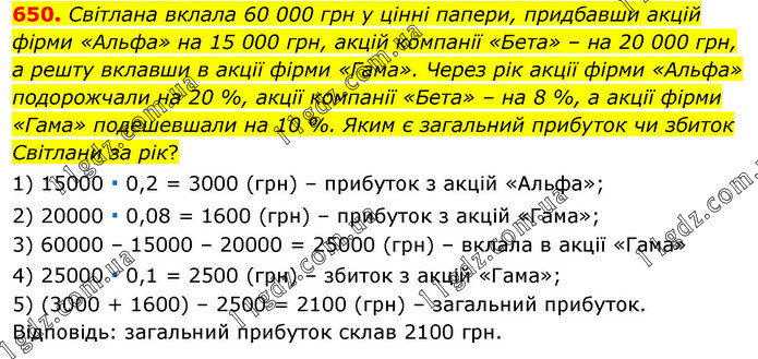 Світлана вклала 60 000 грн у цінні папери, придбавши акцій фірми «Альфа» на 15 000 грн, акцій компанії «Бета» – на 20 000 грн, а решту вклавши в акції фірми «Гама». Через рік акції фірми «Альфа» подорожчали на 20 %, акції компанії «Бета» – на 8 %, а акції фірми «Гама» подешевшали на 10 %. Яким є загальний прибуток чи збиток Світлани за рік? 1) 15000 ∙ 0,2 = 3000 (грн) – прибуток з акцій «Альфа»; 2) 20000 ∙ 0,08 = 1600 (грн) – прибуток з акцій «Гама»; 3) 60000 – 15000 – 20000 = 25000 (грн) – вклала в акції «Гама» 4) 25000 ∙ 0,1 = 2500 (грн) – збиток з акцій «Гама»; 5) (3000 + 1600) – 2500 = 2100 (грн) – загальний прибуток. Відповідь: загальний прибуток склав 2100 грн.