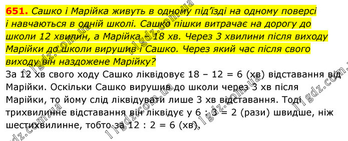 Сашко і Марійка живуть в одному під’їзді на одному поверсі і навчаються в одній школі. Сашко пішки витрачає на дорогу до школи 12 хвилин, а Марійка – 18 хв. Через 3 хвилини після виходу Марійки до школи вирушив і Сашко. Через який час після свого виходу він наздожене Марійку? За 12 хв свого ходу Сашко ліквідовує 18 – 12 = 6 (хв) відставання від Марійки. Оскільки Сашко вирушив до школи через 3 хв після Марійки, то йому слід ліквідувати лише 3 хв відставання. Тоді трихвилинне відставання він ліквідує у 6 : 3 = 2 (рази) швидше, ніж шестихвилинне, тобто за 12 : 2 = 6 (хв).