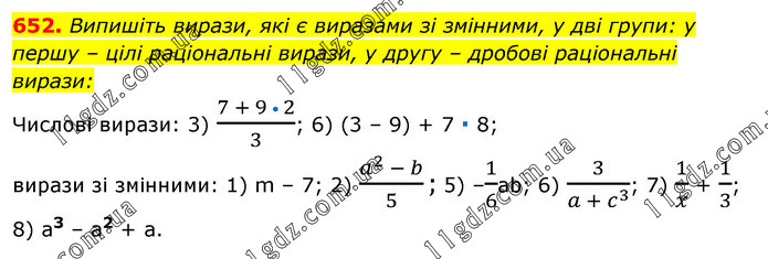 Випишіть вирази, які є виразами зі змінними, у дві групи: у першу – цілі раціональні вирази, у другу – дробові раціональні вирази: Числові вирази: 3) (7 + 9 • 2)/3; 6) (3 – 9) + 7 ∙ 8; вирази зі змінними: 1) m – 7; 2) (a^2 - b)/5; 5) –1/6ab; 6) 3/(a +〖 c〗^3 ); 7) 1/x + 1/3; 8) a3 – a2 + a.