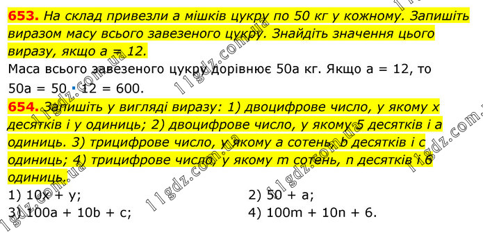 653. Ha склад привезли а мішків цукру по 50 кг у кожному. Запишіть виразом масу всього завезеного цукру. Знайдіть значення цього виразу, якщо а = 12. Маса всього завезеного цукру дорівнює 50а кг. Якщо а = 12, то 50а = 50 ∙ 12 = 600. 654. Запишіть у вигляді виразу: 1) двоцифрове число, у якому х десятків і у одиниць; 2) двоцифрове число, у якому 5 десятків і а одиниць. 3) трицифрове число, у якому а сотень, b десятків і с одиниць; 4) трицифрове число, у якому m сотень, n десятків і 6 одиниць. 1) 10x + у; 3) 100a + 10b + с; 2) 50 + а; 4) 100m + 10n + 6.