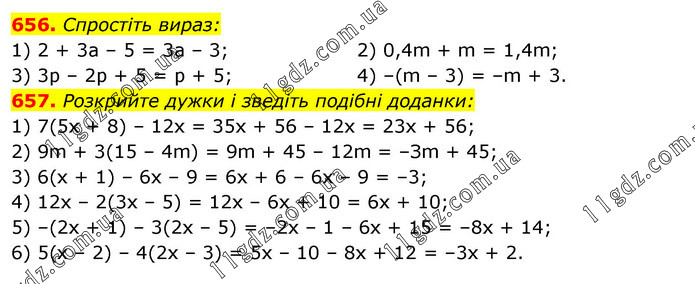 656. Спростіть вираз: 1) 2 + 3a – 5 = 3a – 3; 3) 3р – 2р + 5 = р + 5; 2) 0,4m + m = 1,4m; 4) –(m – 3) = –m + 3. 657. Розкрийте дужки і зведіть подібні доданки: 1) 7(5x + 8) – 12x = 35x + 56 – 12x = 23x + 56; 2) 9m + 3(15 – 4m) = 9m + 45 – 12m = –Зm + 45; 3) 6(х + 1) – 6x – 9 = 6x + 6 – 6x – 9 = –3; 4) 12x – 2(3x – 5) = 12x – 6x + 10 = 6х + 10; 5) –(2х + 1) – 3(2x – 5) = –2х – 1 – 6x + 15 = –8x + 14; 6) 5(x – 2) – 4(2x – 3) = 5x – 10 – 8x + 12 = –3x + 2.