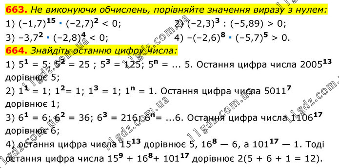 663. He виконуючи обчислень, порівняйте значення виразу з нулем: 1) (–1,7)15 ∙ (–2,7)2 < 0; 3) –3,72 ∙ (–2,8)4 < 0; 2) (–2,3)3 : (–5,89) > 0; 4) –(–2,6)8 ∙ (–5,7)5 > 0. 664. Знайдіть останню цифру числа: 1) 51 = 5; 52 = 25 ; 53 = 125; 5n = ... 5. Остання цифра числа 200513 дорівнює 5; 2) 11 = 1; 12= 1; 13 = 1; 1n = 1. Остання цифра числа 50117 дорівнює 1; 3) 61 = 6; 62 = 36; 63 = 216; 6n= ...6. Остання цифра числа 110617 дорівнює 6; 4) остання цифра числа 1513 дорівнює 5, 168 — 6, а 10117 — 1. Тоді остання цифра числа 159 + 168+ 10117 дорівнює 2(5 + 6 + 1 = 12).