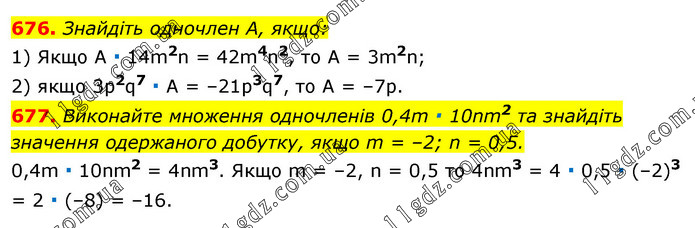 676. Знайдіть одночлен А, якщо: 1) Якщо A ∙ 14m2n = 42m4n2, то A = 3m2n; 2) якщо 3p2q7 ∙ A = –21p3q7, то A = –7p. 677. Виконайте множення одночленів 0,4m ∙ 10nm2 та знайдіть значення одержаного добутку, якщо m = –2; n = 0,5. 0,4m ∙ 10nm2 = 4nm3. Якщо m = –2, n = 0,5 то 4nm3 = 4 ∙ 0,5 ∙ (–2)3 = 2 ∙ (–8) = –16.