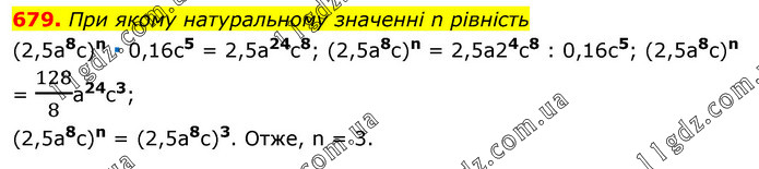При якому натуральному значенні n рівність (2,5а8с)n ∙ 0,16с5 = 2,5a24c8; (2,5а8с)n = 2,5а24с8 : 0,16с5; (2,5а8с)n = 128/8a24c3; (2,5а8с)n = (2,5a8с)3. Отже, n = 3.