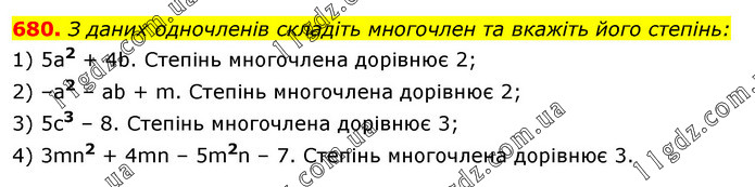 З даних одночленів складіть многочлен та вкажіть його степінь: 1) 5a2 + 4b. Степінь многочлена дорівнює 2; 2) –a2 – ab + m. Степінь многочлена дорівнює 2; 3) 5c3 – 8. Степінь многочлена дорівнює 3; 4) 3mn2 + 4mn – 5m2n – 7. Степінь многочлена дорівнює 3.
