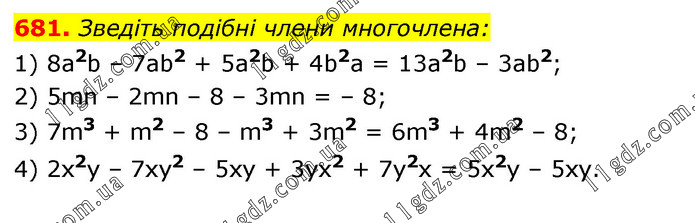 Зведіть подібні члени многочлена: 1) 8a2b – 7ab2 + 5a2b + 4b2a = 13а2b – 3аb2; 2) 5mn – 2mn – 8 – 3mn = – 8; 3) 7m3 + m2 – 8 – m3 + 3m2 = 6m3 + 4m2 – 8; 4) 2x2у – 7xy2 – 5xy + 3ух2 + 7y2x = 5х2у – 5ху.