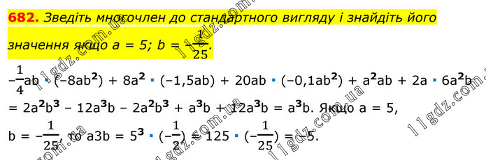 Зведіть многочлен до стандартного вигляду і знайдіть його значення якщо а = 5; b = –1/25. –1/4ab ∙ (–8ab2) + 8a2 ∙ (–1,5аb) + 20ab ∙ (–0,1ab2) + a2ab + 2а ∙ 6а2b = 2a2b3 – 12а3b – 2а2b3 + а3b + 12а3b = а3b. Якщо а = 5, b = –1/25, то a3b = 53 ∙ (–1/2) = 125 ∙ (–1/25) = –5.