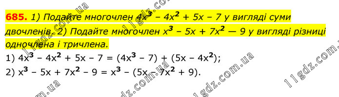 1) Подайте многочлен 4x3 – 4х2 + 5х – 7 у вигляді суми двочленів. 2) Подайте многочлен х3 – 5х + 7х2 — 9 у вигляді різниці одночлена і тричлена. 1) 4x3 – 4x2 + 5x – 7 = (4х3 – 7) + (5х – 4x2); 2) х3 – 5х + 7х2 – 9 = х3 – (5х – 7x2 + 9).
