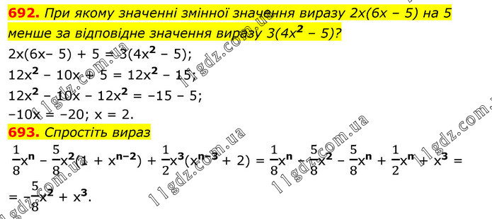 При якому значенні змінної значення виразу 2х(6х – 5) на 5 менше за відповідне значення виразу 3(4х2 – 5)? 2х(6х– 5) + 5 = 3(4х2 – 5); 12х2 – 10х + 5 = 12х2 – 15; 12х2 – 10x – 12x2 = –15 – 5; –10х = –20; х = 2. 693. Спростіть вираз 1/8хn – 5/8х2(1 + хn–2) + 1/2х3(хn–3 + 2) = 1/8хn – 5/8х2 – 5/8хn + 1/2хn + х3 = = –5/8х2 + х3.
