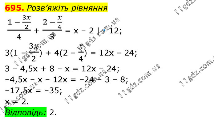 Розв’яжіть рівняння (1 - 3x/2)/4 + (2 - x/4)/3 = х – 2 | ∙ 12; 3(1 – 3x/2) + 4(2 – x/4) = 12x – 24; З – 4,5х + 8 – х = 12x – 24; –4,5х – х – 12x = –24 – 3 – 8; –17,5x = –35; x = 2. Відповідь: 2.