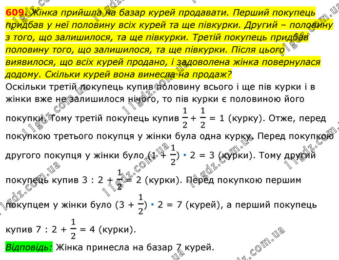 Жінка прийшла на базар курей продавати. Перший покупець придбав у неї половину всіх курей та ще півкурки. Другий – половину з того, що залишилося, та ще півкурки. Третій покупець придбав половину того, що залишилося, та ще півкурки. Після цього виявилося, що всіх курей продано, і задоволена жінка повернулася додому. Скільки курей вона винесла на продаж? Оскільки третій покупець купив половину всього і ще пів курки і в жінки вже не залишилося нічого, то пів курки є половиною його покупки. Тому третій покупець купив 1/2 + 1/2 = 1 (курку). Отже, перед покупкою третього покупця у жінки була одна курку. Перед покупкою другого покупця у жінки було (1 + 1/2) ∙ 2 = 3 (курки). Тому другий покупець купив 3 : 2 + 1/2 = 2 (курки). Перед покупкою першим покупцем у жінки було (3 + 1/2) ∙ 2 = 7 (курей), а перший покупець купив 7 : 2 + 1/2 = 4 (курки). Відповідь: Жінка принесла на базар 7 курей.