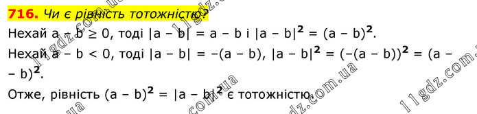 Чи є рівність тотожністю? Нехай а – b ≥ 0, тоді |a – b| = a – b i |a – b|2 = (а – b)2. Нехай а – b < 0, тоді |а – b| = –(а – b), |а – b|2 = (–(а – b))2 = (а – – b)2. Отже, рівність (а – b)2 = |a – b|2 є тотожністю.