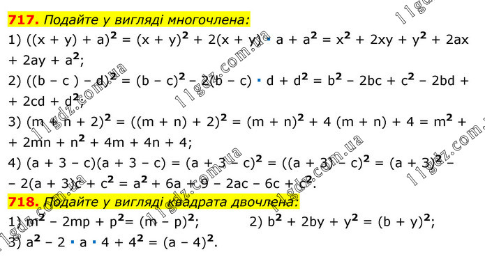 717. Подайте у вигляді многочлена: 1) ((x + у) + а)2 = (х + у)2 + 2(х + y) ∙ а + а2 = x2 + 2ху + у2 + 2ах + 2ау + а2; 2) ((b – c ) – d)2 = (b – c)2 – 2(b – c) ∙ d + d2 = b2 – 2bс + с2 – 2bd + + 2сd + d2; 3) (m + n + 2)2 = ((m + n) + 2)2 = (m + n)2 + 4 (m + n) + 4 = m2 + + 2mn + n2 + 4m + 4n + 4; 4) (а + 3 – с)(а + 3 – с) = (а + 3 – с)2 = ((а + 3) – с)2 = (а + З)2 – – 2(а + 3)c + c2 = а2 + 6а + 9 – 2ас – 6с + с2. 718. Подайте у вигляді квадрата двочлена: 1) m2 – 2mр + р2= (m – р)2; 3) а2 – 2 ∙ а ∙ 4 + 42 = (а – 4)2. 2) b2 + 2bу + у2 = (b + у)2;