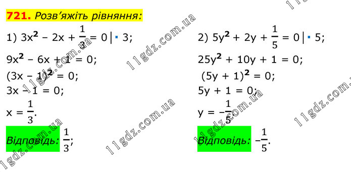 Розв’яжіть рівняння: 1) 3x2 – 2x + 1/3 = 0│∙ 3; 9x2 – 6x + 1 = 0; (3x – 1)2 = 0; 3x – 1 = 0; x = 1/3. Відповідь: 1/3; 2) 5y2 + 2y + 1/5 = 0│∙ 5; 25y2 + 10y + 1 = 0; (5y + 1)2 = 0; 5y + 1 = 0; y = –1/5. Відповідь: –1/5.