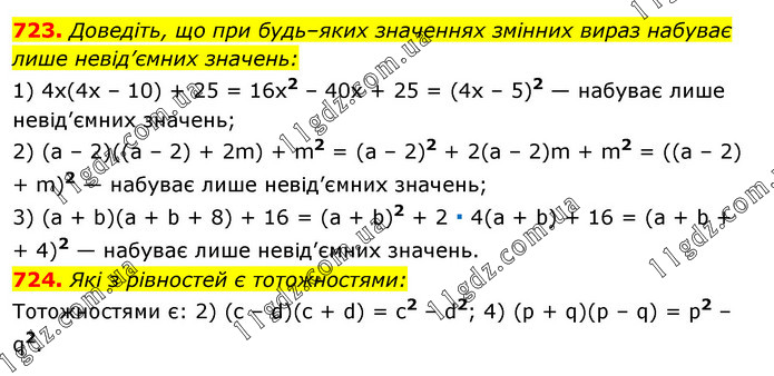 723. Доведіть, що при будь–яких значеннях змінних вираз набуває лише невід’ємних значень: 1) 4x(4x – 10) + 25 = 16x2 – 40x + 25 = (4x – 5)2 — набуває лише невід’ємних значень; 2) (а – 2)((а – 2) + 2m) + m2 = (а – 2)2 + 2(а – 2)m + m2 = ((а – 2) + m)2 — набуває лише невід’ємних значень; 3) (а + b)(a + b + 8) + 16 = (а + b)2 + 2 ∙ 4(а + b) + 16 = (а + b + + 4)2 — набуває лише невід’ємних значень. 724. Які з рівностей є тотожностями: Тотожностями є: 2) (с – d)(c + d) = c2 – d2; 4) (p + q)(p – q) = p2 – q2.