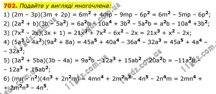 Подайте у вигляді многочлена: 1) (2m – 3р)(3m + 2р) = 6m2 + 4mр – 9mр – 6р2 = 6m2 – 5mр – 6р2; 2) (2а2 + b)(3b – 5а2) = 6а2b – 10a4 + Зb2 – 5а2b = a2b – 10a4 +Зb2; 3) (7х2 – 2х)(3х + 1) = 21х3 + 7x2 – 6х2 – 2х = 21х3 + х2 – 2х; 4) (5a3 – 4a2)(9a2 + 8а) = 45а5 + 40а4 – 36а4 – З2а3 = 45а5 + 4а4 – – З2а3; 5) (3а2 + 5ba)(3b – 4а) = 9а2b – 12а3 + 15ab2 – 20а2b = –11a2b – – 12а3 + 15аb2; 6) (mn – n2)(4n3 + 2n2m) = 4mn4 + 2m2n3 – 4n5 – 2n4m = 2mn4 + + 2m2n3 – 4n5.
