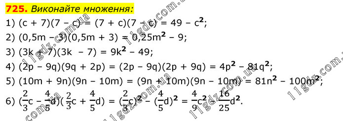 Виконайте множення: 1) (c + 7)(7 – c) = (7 + c)(7 – c) = 49 – c2; 2) (0,5m – 3)(0,5m + 3) = 0,25m2 – 9; 3) (3k + 7)(3k – 7) = 9k2 – 49; 4) (2р – 9q)(9q + 2p) = (2p – 9q)(2p + 9q) = 4p2 – 81q2; 5) (10m + 9n)(9n – 10m) = (9n + 10m)(9n – 10m) = 81n2 – 100m2; 6) (2/3c – 4/5d)( 2/3c + 4/5d) = (2/3c)2 – (4/5d)2 = 4/9c2 – 16/25d2.