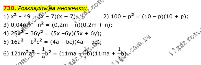 Розкладіть на множники: 1) x2 – 49 = (х – 7)(х + 7); 2) 100 – p2 = (10 – р)(10 + р); 3) 0,04m2 – n2 = (0,2m – n)(0,2m + n); 4) 25х2 – 36у2 = (5х –6у)(5х + 6у); 5) 16а2 – b2с2 = (4а – bc)(4a + bс); 6) 121m2а2 – 1/9b2 = (11mа – 1/3b)(11mа + 1/3b).