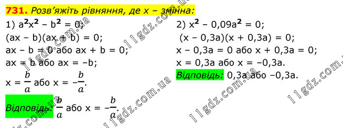 Розв’яжіть рівняння, де х – змінна: 1) а2х2 – b2 = 0; (ах – b)(ах + b) = 0; ах – b = 0 або ах + b = 0; ах = b або ах = –b; х = b/a або х = –b/a. Відповідь: b/a або х = –b/a. 2) x2 – 0,09а2 = 0; (х – 0,3а)(x + 0,3а) = 0; х – 0,3а = 0 або х + 0,3а = 0; х = 0,3а або х = –0,3а. Відповідь: 0,3а або –0,3а.