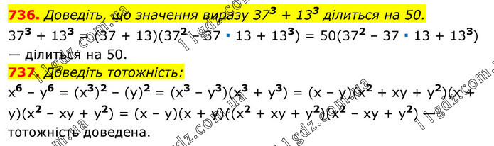736. Доведіть, що значення виразу З73 + 133 ділиться на 50. 373 + 133 = (37 + 13)(372 – 37 ∙ 13 + 133) = 50(372 – 37 ∙ 13 + 133) — ділиться на 50. 737. Доведіть тотожність: x6 – у6 = (x3)2 – (y)2 = (х3 – у3)(х3 + у3) = (х – у)(x2 + ху + у2)(х + у)(х2 – ху + у2) = (х – у)(х + у)((х2 + ху + у2)(х2 – ху + у2) — тотожність доведена.