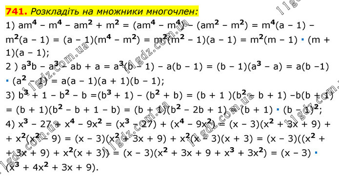 Розкладіть на множники многочлен: 1) аm4 – m4 – аm2 + m2 = (аm4 – m4) – (аm2 – m2) = m4(а – 1) – m2(а – 1) = (a – 1)(m4 – m2) = m2(m2 – 1)(а – 1) = m2(m – 1) ∙ (m + 1)(а – 1); 2 ) a3b – a3 – ab + a = а3(b – 1) – а(b – 1) = (b – 1)(а3 – а) = а(b –1) ∙ (а2 – 1) = а(а – 1)(а + 1)(b – 1); 3) b3 + 1 – b2 – b =(b3 + 1) – (b2 + b) = (b + 1 )(b2 – b + 1) –b(b + 1) = (b + 1)(b2 – b + 1 – b) = (b + 1)(b2 – 2b + 1) = (b + 1) ∙ (b – 1)2; 4) x3 – 27 + x4 – 9х2 = (х3 – 27) + (х4 – 9х2) = (х – 3)(х2 + Зх + 9) + + х2(х2 – 9) = (х – 3)(х2 + Зх + 9) + х2(х – 3)(х + 3) = (х – 3)((х2 + + 3х + 9) + х2(х + 3)) = (х – 3)(х2 + Зх + 9 + x3 + Зх2) = (х – З) ∙ (х3 + 4х2 + Зх + 9).