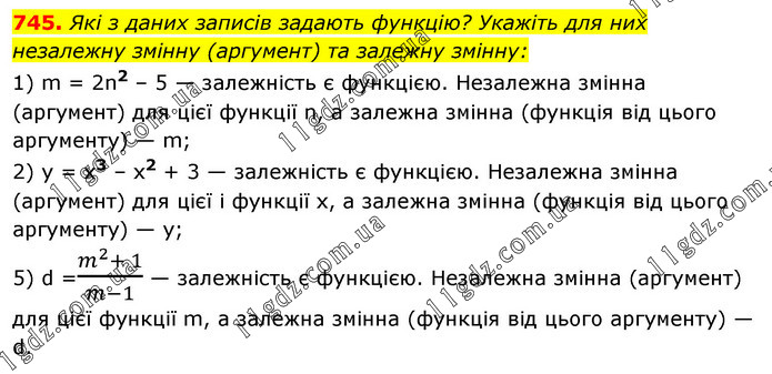 Які з даних записів задають функцію? Укажіть для них незалежну змінну (аргумент) та залежну змінну: 1) m = 2n2 – 5 — залежність є функцією. Незалежна змінна (аргумент) для цієї функції n, а залежна змінна (функція від цього аргументу) — m; 2) у = x3 – x2 + 3 — залежність є функцією. Незалежна змінна (аргумент) для цієї і функції x, а залежна змінна (функція від цього аргументу) — у; 5) d =(m^2+ 1)/(m-1) — залежність є функцією. Незалежна змінна (аргумент) для цієї функції m, а залежна змінна (функція від цього аргументу) — d.