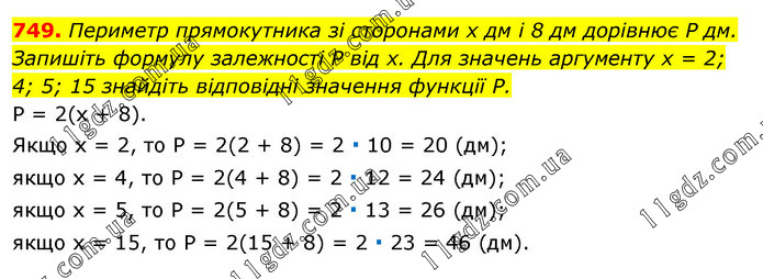 Периметр прямокутника зі сторонами х дм і 8 дм дорівнює P дм. Запишіть формулу залежності P від х. Для значень аргументу х = 2; 4; 5; 15 знайдіть відповідні значення функції Р. Р = 2(х + 8). Якщо x = 2, то P = 2(2 + 8) = 2 ∙ 10 = 20 (дм); якщо x = 4, то P = 2(4 + 8) = 2 ∙ 12 = 24 (дм); якщо x = 5, то P = 2(5 + 8) = 2 ∙ 13 = 26 (дм); якщо x = 15, то P = 2(15 + 8) = 2 ∙ 23 = 46 (дм).