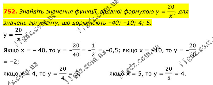 Знайдіть значення функції, заданої формулою у = 20/x, для значень аргументу, що дорівнюють –40; –10; 4; 5. у = 20/x. Якщо х = – 40, то у = –20/40 = –1/2 = –0,5; якщо x = –10, то у = –20/10 = = –2; якщо х = 4, то у = 20/4 = 5; якщо х = 5, то у = 20/5 = 4.
