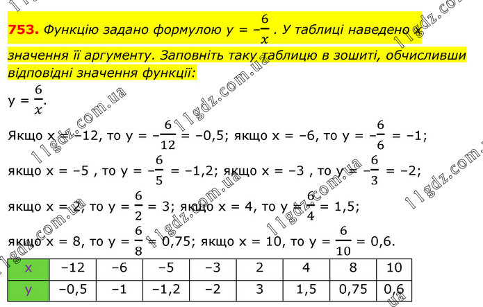 Функцію задано формулою у = –6/x . У таблиці наведено х значення її аргументу. Заповніть таку таблицю в зошиті, обчисливши відповідні значення функції: у = 6/x. Якщо х = –12, то у = –6/12 = –0,5; якщо x = –6, то у = –6/6 = –1; якщо x = –5 , то у = –6/5 = –1,2; якщо х = –3 , то у = –6/3 = –2; якщо х = 2, то у = 6/2 = 3; якщо x = 4, то у = 6/4 = 1,5; якщо х = 8, то у = 6/8 = 0,75; якщо х = 10, то у = 6/10 = 0,6.