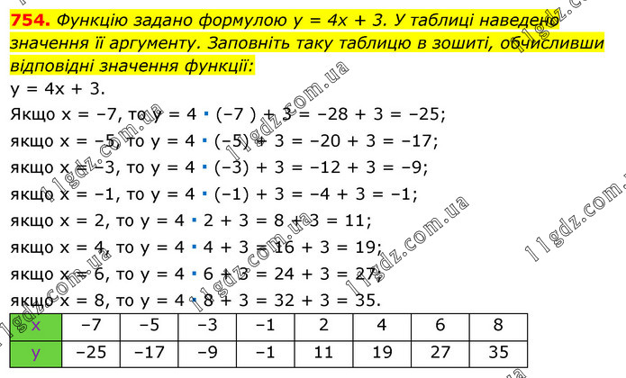 Функцію задано формулою у = 4х + 3. У таблиці наведено значення її аргументу. Заповніть таку таблицю в зошиті, обчисливши відповідні значення функції: у = 4х + 3. Якщо х = –7, то у = 4 ∙ (–7 ) + 3 = –28 + 3 = –25; якщо х = –5, то у = 4 ∙ (–5) + 3 = –20 + 3 = –17; якщо х = –3, то у = 4 ∙ (–3) + 3 = –12 + 3 = –9; якщо х = –1, то у = 4 ∙ (–1) + 3 = –4 + 3 = –1; якщо х = 2, то у = 4 ∙ 2 + 3 = 8 + 3 = 11; якщо х = 4, то у = 4 ∙ 4 + 3 = 16 + 3 = 19; якщо х = 6, то у = 4 ∙ 6 + 3 = 24 + 3 = 27; якщо х = 8, то у = 4 ∙ 8 + 3 = 32 + 3 = 35.