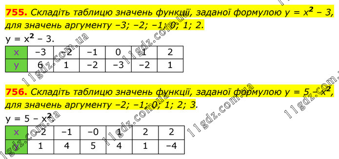 Складіть таблицю значень функції, заданої формулою у = x2 – 3, для значень аргументу –3; –2; –1; 0; 1; 2. y = x2 – 3. Складіть таблицю значень функції, заданої формулою у = 5 – х2, для значень аргументу –2; –1; 0; 1; 2; 3. у = 5 – х2.