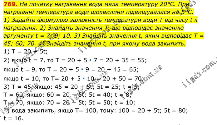 На початку нагрівання вода мала температуру 20°С. При нагріванні температура води щохвилини підвищувалася на 5°С. 1) Задайте формулою залежність температури води T від часу t її нагрівання. 2) Знайдіть значення Т, що відповідає значенню аргументу t = 7; 9; 10. 3) Знайдіть значення t, яким відповідає T = 45; 60; 70. 4) Знайдіть значення t, при якому вода закипить. 1) T = 20 + 5t; 2) якщо t = 7, то T = 20 + 5 ∙ 7 = 20 + 35 = 55; якщо t = 9, то T = 20 + 5 ∙ 9 = 20 + 45 = 65; якщо t = 10, то T= 20 + 5 ∙ 10 = 20 + 50 = 70; 3) T = 45, якщо: 45 = 20 + 5t; 5t = 25; t = 5; T = 60, якщо: 60 = 20 + 5t; 5t = 40; t = 8; T = 70, якщо: 70 = 20 + 5t; 5t = 50; t = 10; 4) вода закипить, якщо T= 100, тому: 100 = 20 + 5t; 5t = 80; t = 16.