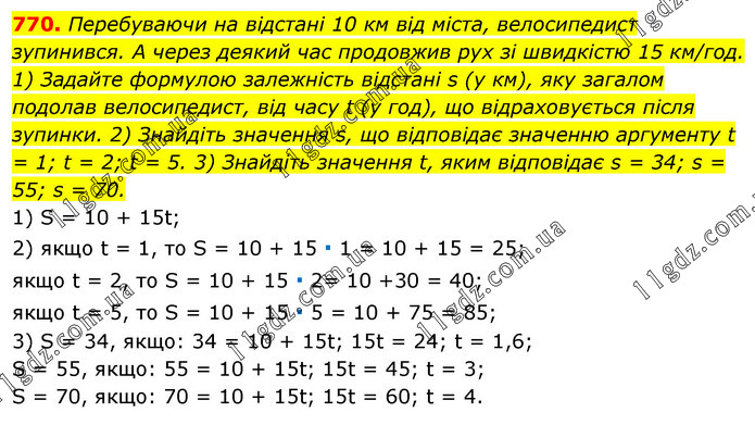 Перебуваючи на відстані 10 км від міста, велосипедист зупинився. А через деякий час продовжив рух зі швидкістю 15 км/год. 1) Задайте формулою залежність відстані s (у км), яку загалом подолав велосипедист, від часу t (у год), що відраховується після зупинки. 2) Знайдіть значення s, що відповідає значенню аргументу t = 1; t = 2; t = 5. 3) Знайдіть значення t, яким відповідає s = 34; s = 55; s = 70. 1) S = 10 + 15t; 2) якщо t = 1, то S = 10 + 15 ∙ 1 = 10 + 15 = 25; якщо t = 2, то S = 10 + 15 ∙ 2= 10 +30 = 40; якщо t = 5, то S = 10 + 15 ∙ 5 = 10 + 75 = 85; 3) S = 34, якщо: 34 = 10 + 15t; 15t = 24; t = 1,6; S = 55, якщо: 55 = 10 + 15t; 15t = 45; t = 3; S = 70, якщо: 70 = 10 + 15t; 15t = 60; t = 4.
