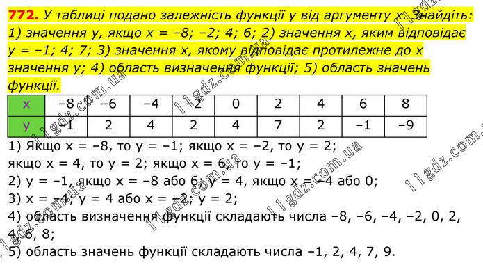 У таблиці подано залежність функції у від аргументу х. Знайдіть: 1) значення у, якщо х = –8; –2; 4; 6; 2) значення х, яким відповідає у = –1; 4; 7; 3) значення х, якому відповідає протилежне до х значення у; 4) область визначення функції; 5) область значень функції. 1) Якщо х = –8, то у = –1; якщо х = –2, то у = 2; якщо x = 4, то y = 2; якщо х = 6, то у = –1; 2) у = –1, якщо х = –8 або 6; у = 4, якщо х = –4 або 0; 3) х = –4; у = 4 або х = –2; у = 2; 4) область визначення функції складають числа –8, –6, –4, –2, 0, 2, 4, 6, 8; 5) область значень функції складають числа –1, 2, 4, 7, 9.