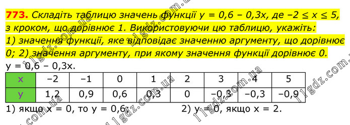 Складіть таблицю значень функції у = 0,6 – 0,3х, де –2 ≤ х ≤ 5, з кроком, що дорівнює 1. Використовуючи цю таблицю, укажіть: 1) значення функції, яке відповідає значенню аргументу, що дорівнює 0; 2) значення аргументу, при якому значення функції дорівнює 0. у = 0,6 – 0,3х.