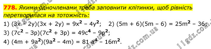 Якими одночленами треба заповнити клітинки, щоб рівність перетворилася на тотожність: 1) (Зх – 2у)(3х + 2у) = 9х2 – 4у2; 2) (5m + 6)(5m – 6) = 25m2 – 36; 3) (7с2 – Зр)(7с2 + Зр) = 49с4 – 9р2; 4) (4m + 9а2)(9а2 – 4m) = 81 а4 – 16m2.