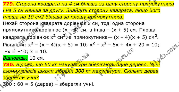 779. Сторона квадрата на 4 см більша за одну сторону прямокутника і на 5 см менша за другу. Знайдіть сторону квадрата, якщо його площа на 10 см2 більша за площу прямокутника. Нехай сторона квадрата дорівнює х см, тоді одна сторона прямокутника дорівнює (x – 4) см, а інша – (х + 5) см. Площа квадрата дорівнює х2 см2, а прямокутника— (х – 4)(х + 5) см2. Рівняння: x2 – (x – 4)(x + 5) = 10; х2 – х2 – 5х + 4х + 20 = 10; –x = –10; x = 10. Відповідь: 10 см. 780. Відомо, що 60 кг макулатури зберігають одне дерево. Учні сьомих класів школи зібрали 300 кг макулатури. Скільки дерев зберегли учні? 300 : 60 = 5 (дерев) – зберегли учні.