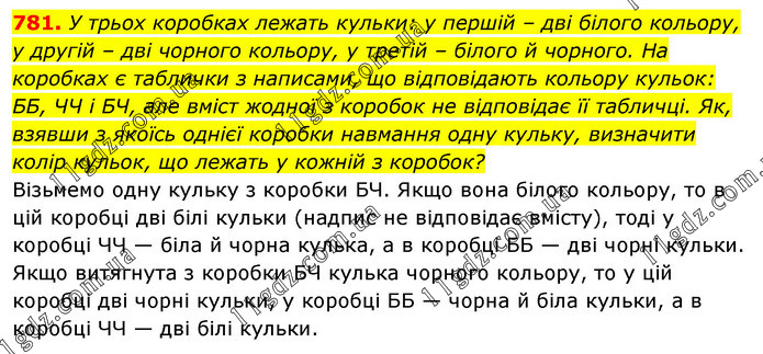 У трьох коробках лежать кульки: у першій – дві білого кольору, у другій – дві чорного кольору, у третій – білого й чорного. На коробках є таблички з написами, що відповідають кольору кульок: ББ, ЧЧ і БЧ, але вміст жодної з коробок не відповідає її табличці. Як, взявши з якоїсь однієї коробки навмання одну кульку, визначити колір кульок, що лежать у кожній з коробок? Візьмемо одну кульку з коробки БЧ. Якщо вона білого кольору, то в цій коробці дві білі кульки (надпис не відповідає вмісту), тоді у коробці ЧЧ — біла й чорна кулька, а в коробці ББ — дві чорні кульки. Якщо витягнута з коробки БЧ кулька чорного кольору, то у цій коробці дві чорні кульки, у коробці ББ — чорна й біла кульки, а в коробці ЧЧ — дві білі кульки.
