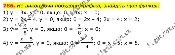 He виконуючи побудови графіка, знайдіть нулі функції: 1) y = 3х. у = 0, якщо: 0 = Зх; х = 0; 2) y = 2х – 4. y = 0, якщо: 0 = 2х – 4; 2x = 4; x = 2; 3) y = –x/8. у = 0, якщо: 0 = –x/8; х = 0; 4) y = (x - 5)/4. y = 0, якщо: 0 = (x - 5)/4; 0 = x – 5; x = 5.